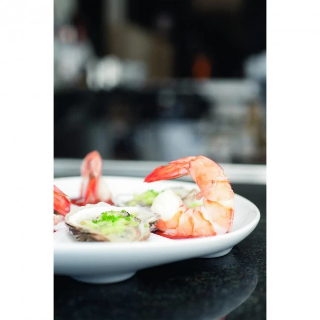 La forme ouverte jonglant entre l’ovale et le rond de l’assiette à huître en porcelaine invite à la dégustation de vos huîtres qu’elles soient chaudes ou froides, elles seront parfaitement mises en valeur.
