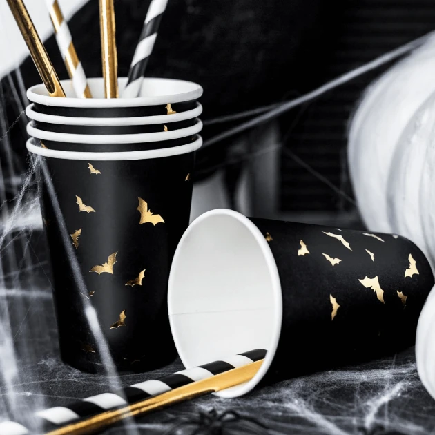 Si vous n’êtes pas à l’aise avec les décorations Halloween terrifiantes mais que vous voulez tout de même rester dans le thème, optez pour ce set de 6 Gobelets Halloween en Papier PartyDéco. A la fois sobres et élégants, ces verres Halloween sont parés d’un coloris noir mat ornée de nombreuses chauves-souris de couleur or qui rappelleront le thème Halloween.